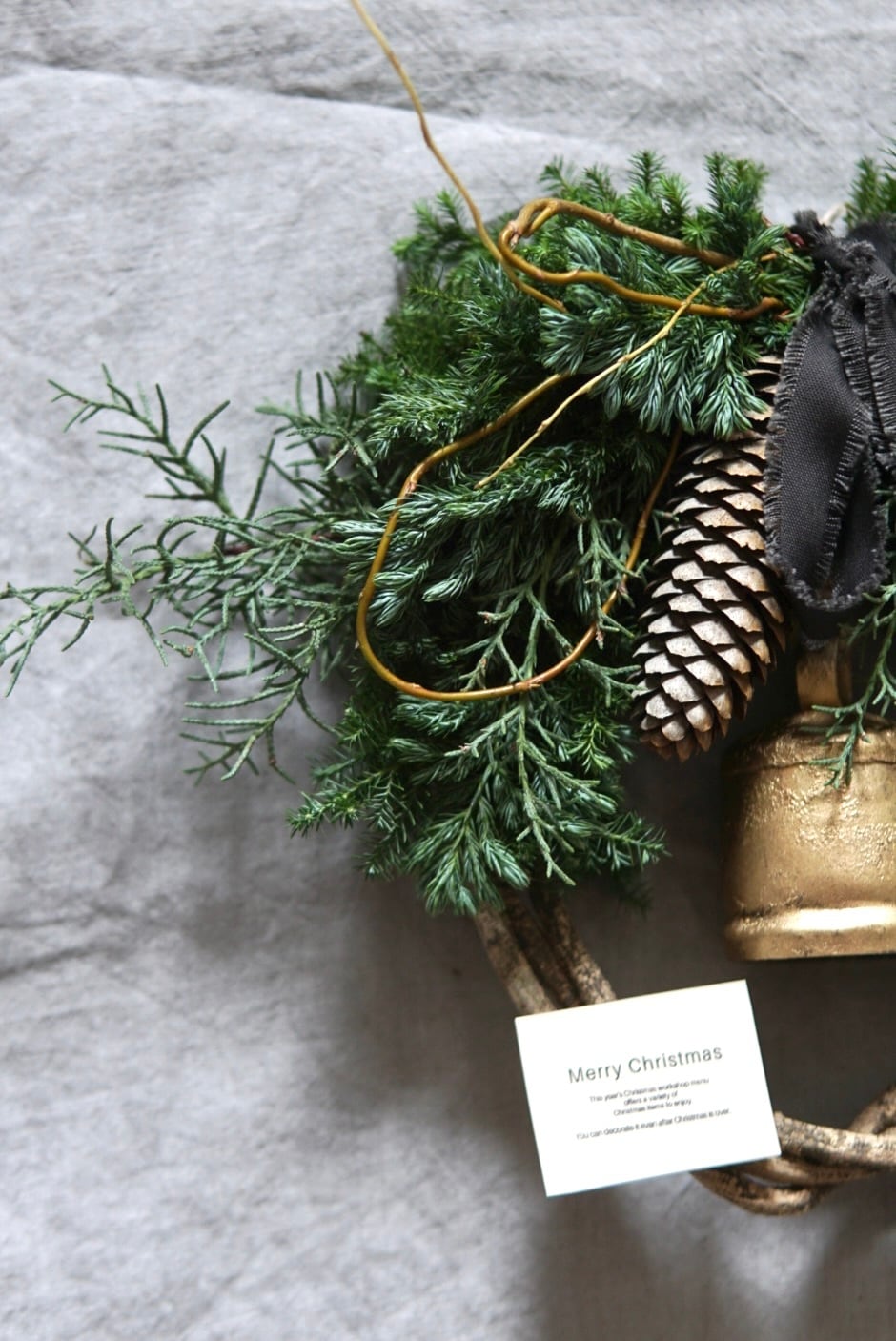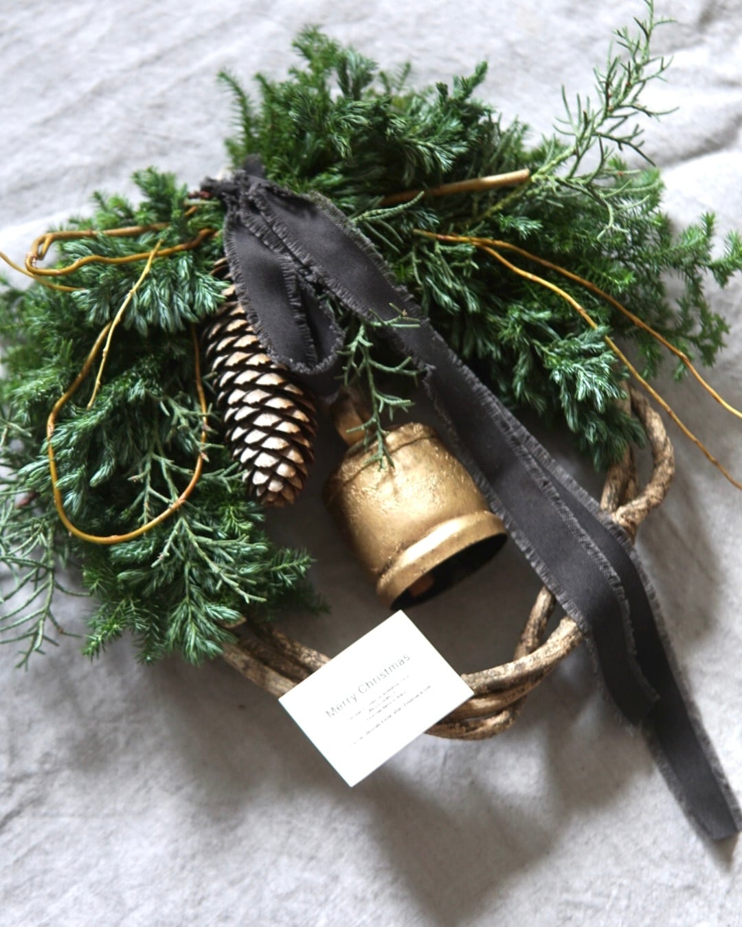 ナチュラルなリース台にグリーンベースでアレンジし、ベルやドイツトウヒ、ドラゴン柳で飾り付けいたしました
