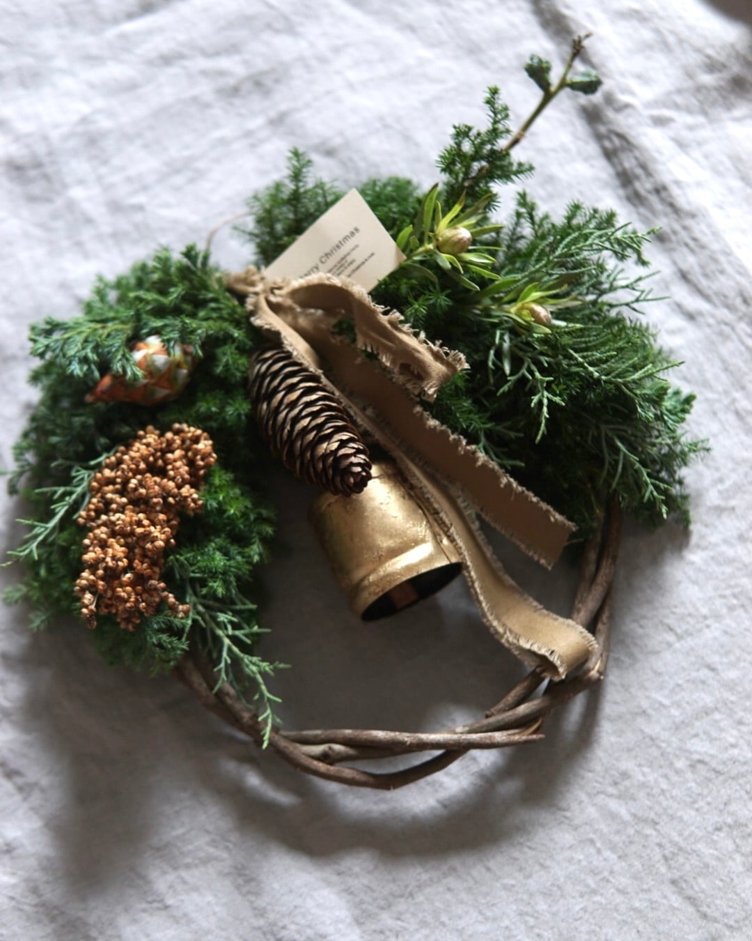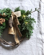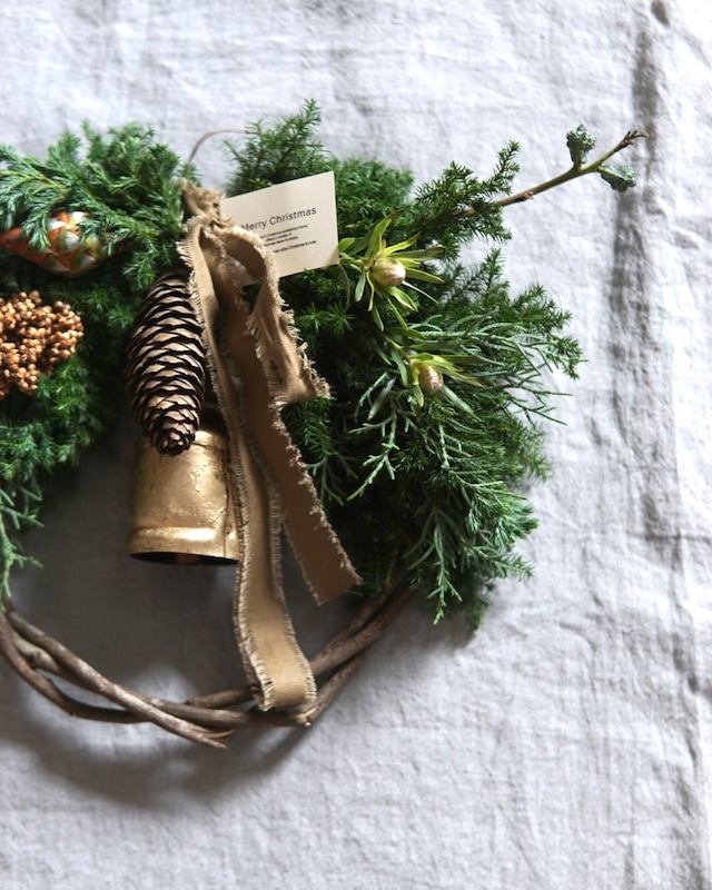 ナチュラルなリース台にグリーンベースでアレンジし、ベルやドイツトウヒなどで飾り付けいたしました